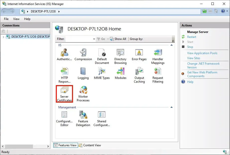 点击服务器证书图标。您可以在 IIS 下找到它,位于窗口的中央窗格中。