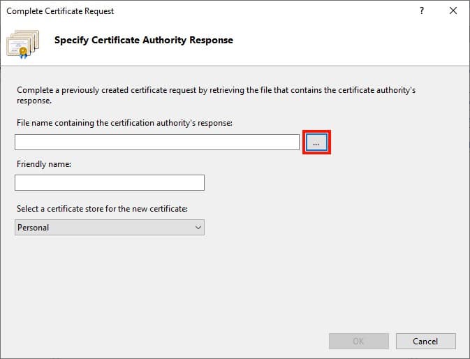 在下一个窗口中,您将看到“完成证书请求”向导。接下来你要做的就是点击标有 – 的按钮……,这将启动文件打开对话框。