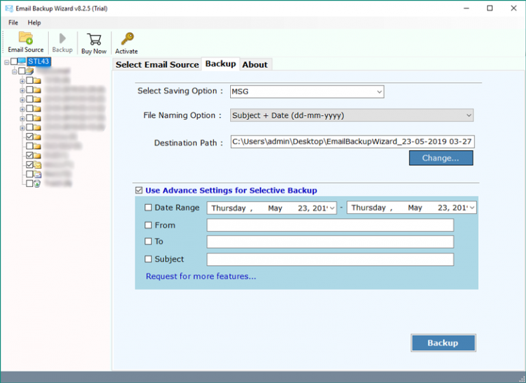 在此步骤中,请填写您的 Gmail 帐户的所有登录详细信息。另外,如果您想传输一些选择性消息,请启用“使用高级设置进行选择性备份”选项。