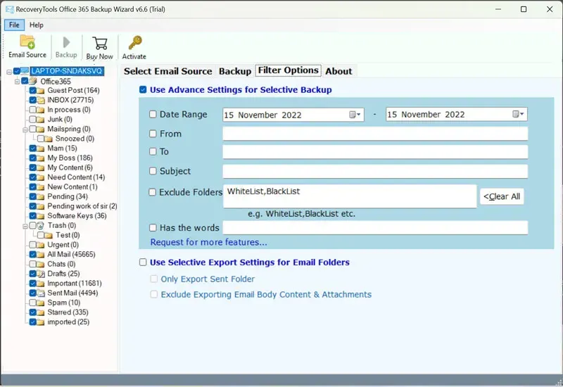 - 现在,是时候了设置高级过滤器按日期范围、电子邮件地址和电子邮件主题将 O365 迁移到 G Suite。