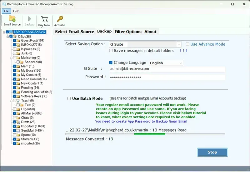 - 检查使用批处理模式用于从 Office 365 批量移动到 G Suite 的选项复选框。