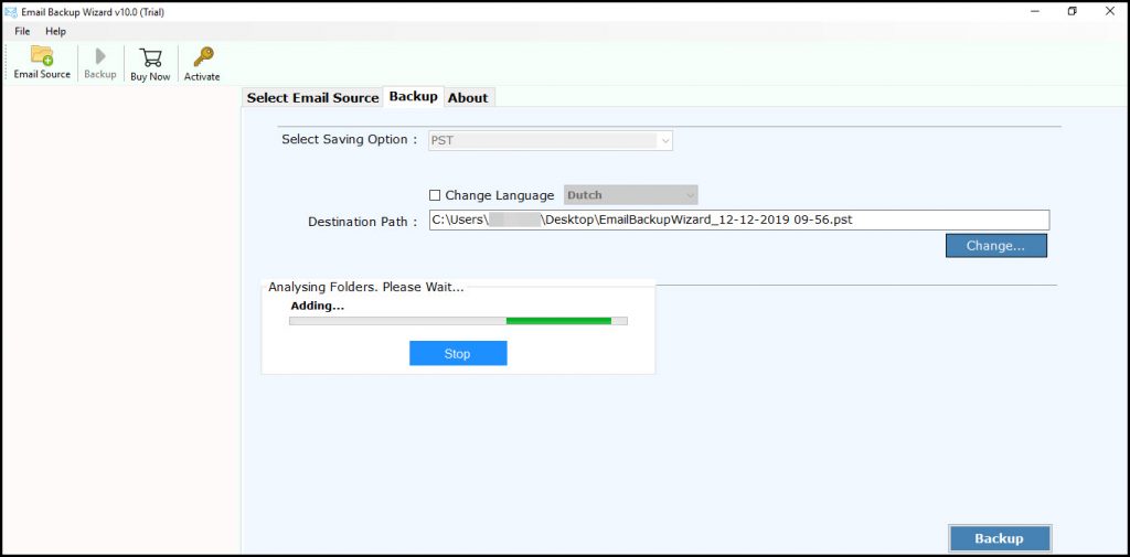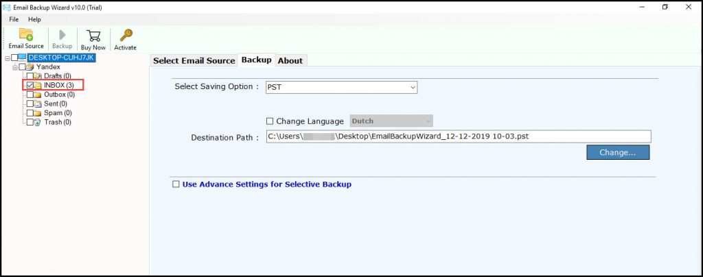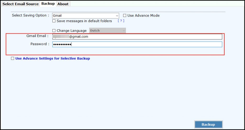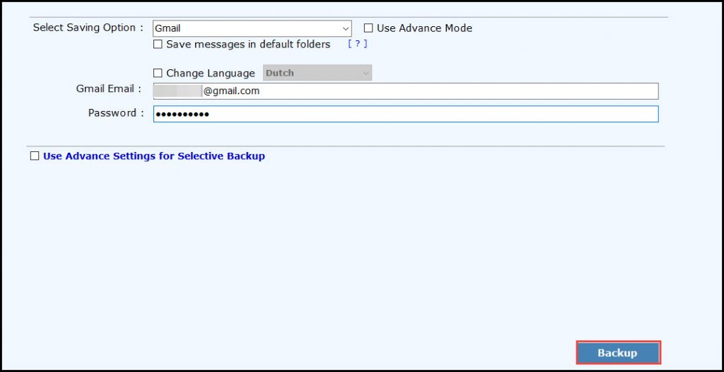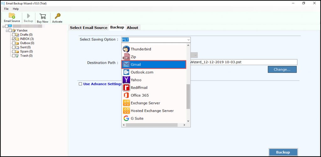 9.最后,单击“备份”按钮以允许将邮箱从 Yandex 导入到 Gmail 帐户的解决方案。