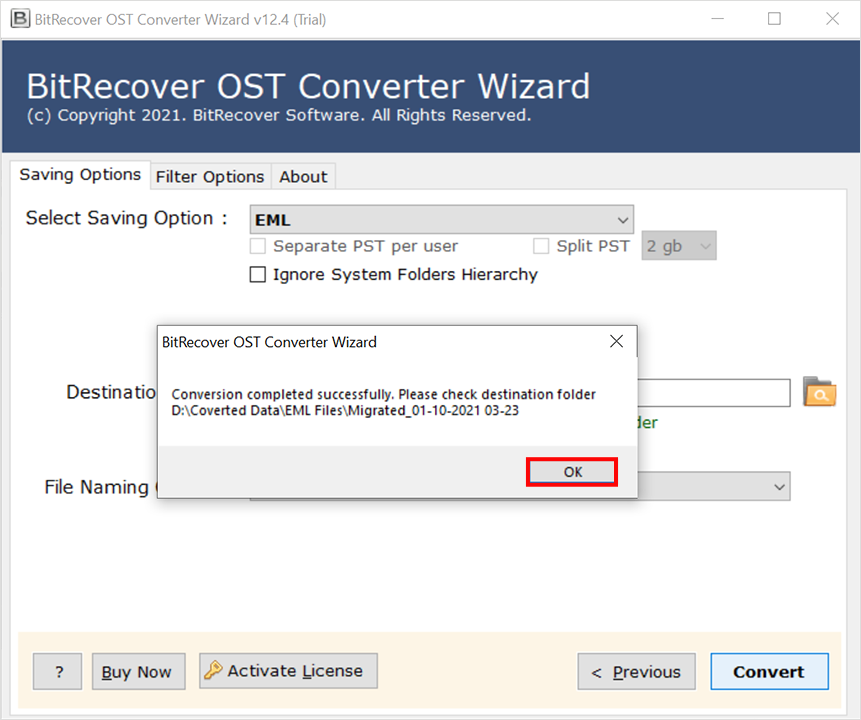 - 最后,单击“转换”按钮将 Outlook OST 数据文件移动到另一个驱动器。
