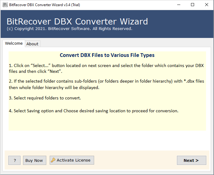 - 现在使用“上传 DBX 文件选择文件“ 和 ”选择文件夹”选项并单击“下一个“ 图标。