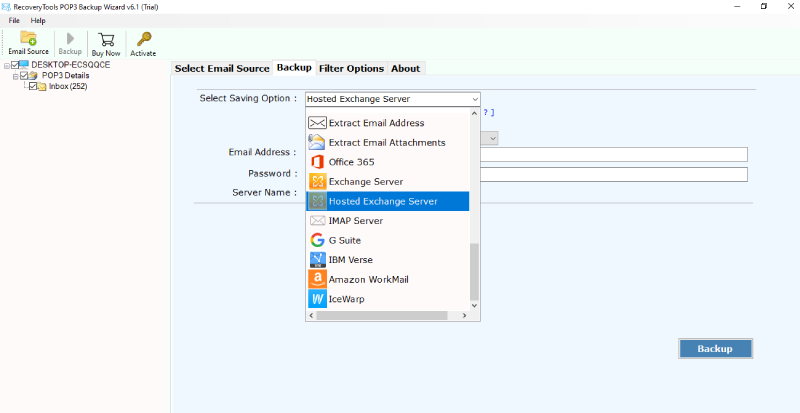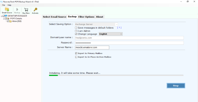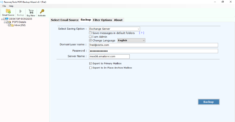 如果您希望将 POP3 邮箱转换为 Exchange Online,请尝试POP3 电子邮件备份向导。它提供了将 POP3 更改为 Exchange Server、Exchange Online、Hosted Exchange 的直接功能。您甚至可以使用此工具将批量 POP3 电子邮件帐户迁移到 Exchange。由于它是一个用户友好的应用程序,因此任何用户(家庭/企业)都可以轻松使用它。