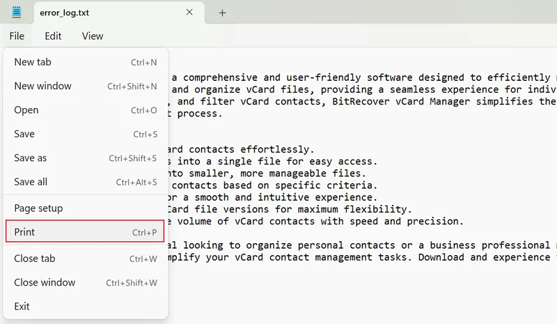 打印 .txt 文件的手动解决方案的缺点限制了其使用。因此,自动化软件已成为打印 TXT 文档文件的完美媒介,我们将在这里讨论一款这样的软件。 BitRecover TXT 文件转换器可帮助您将 TXT 文件转换为各种格式,并具有完整的数据安全性。该软件可以离线工作,帮助您打印记事本 TXT 文件。您可以依靠此实用程序一次打印多个文本文件,而不会丢失数据。此外,您甚至可以尝试演示版本,通过将五个 TXT 文件转换为十七种格式来测试软件的功能。