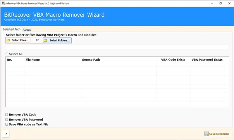 BitRecover VBA Macro Remover 是从 PowerPoint 中删除宏的完美解决方案。我们都知道一个VBA项目可以存储多个宏。该宏删除器能够删除任何 VBA 项目中的所有宏,因此您可以轻松地从所有插入的项目中批量删除它们。此外,它还为您提供了选中和取消选中特定 VBA 项目以将其删除的选项。该工具包是一个很好的解决方案从Word文档中删除宏。