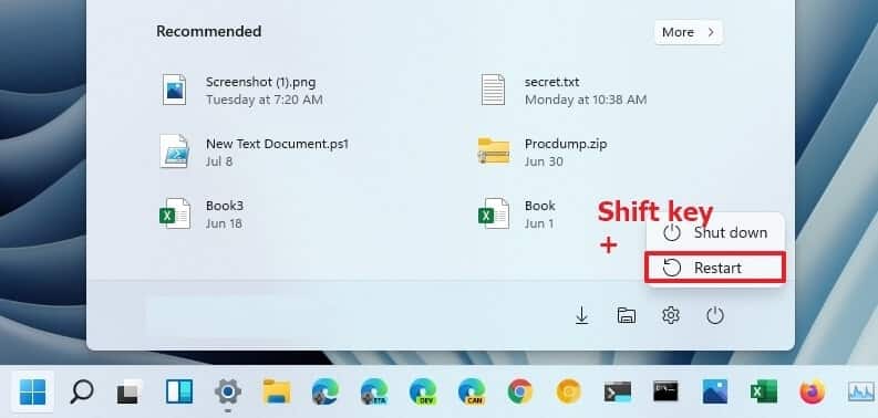 - 按住键盘上的shift键,点击开始菜单->电源然后选择重启