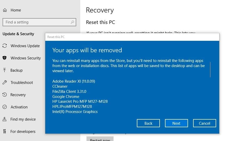 - 下一个屏幕将显示您已安装的第三方应用程序的列表,这些应用程序将在重置过程中删除。最好记下所有已安装的应用程序,以便稍后安装。