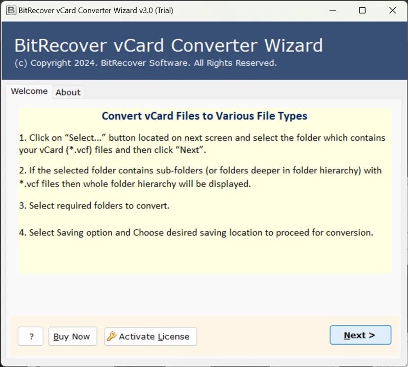 vCard Contacts Converter 是将 VCF 文件分解为单个联系人的完美解决方案。该软件有一个独立的选项,可以分割 vCard 文件并将 vCard 文件合并为一个。您可以根据您的工作需求启用任何选项。