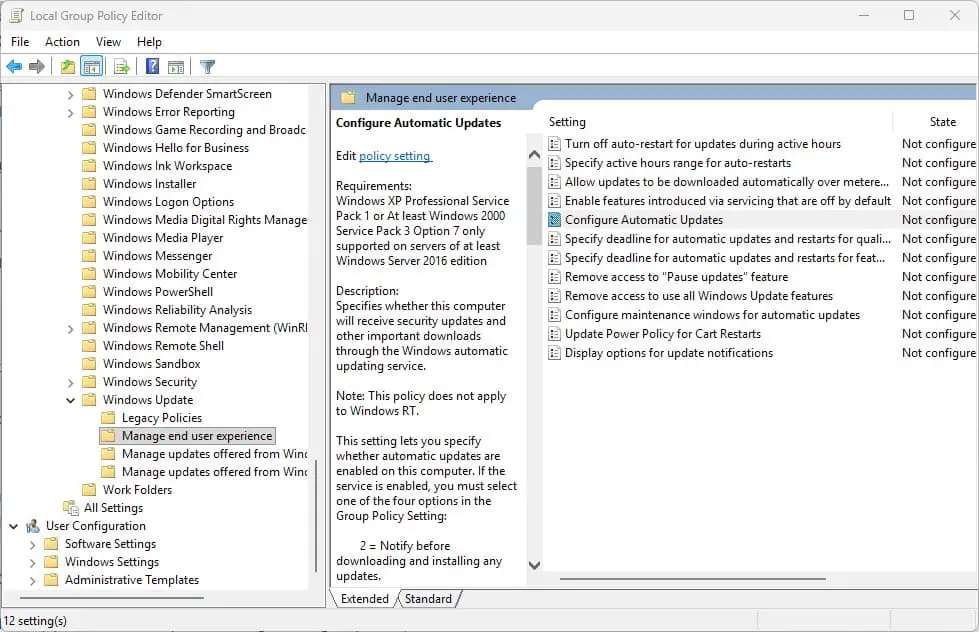 - 导航至:计算机配置 → 管理模板 → Windows 组件 → Windows 更新 → 管理最终用户体验