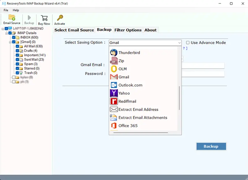 除了 Gmail 之外,该工具还提供各种其他保存选项。这些选项包括 G Suite、雅虎邮件、Office 365、Outlook.com、IBM Verse、Rediffmail、IBM Domino Server、Zimbra Collaboration Server 等。