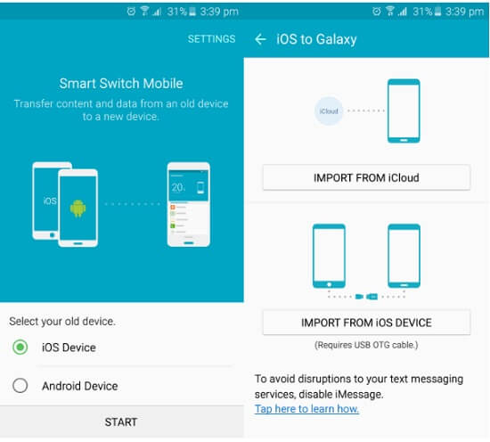 - 步骤 2. 在 Samsung S22 上,系统会询问您希望如何导入数据。然后选择一个 iOS 设备并选择是否要从 iCloud 或设备存储传输数据。