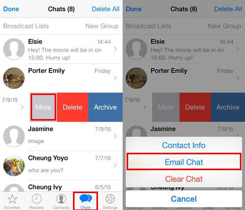 - 步骤2.接下来是滑动聊天并单击“更多”选项以获得各种功能。然后单击电子邮件聊天选项。启动后,您还将访问聊天选项并选择电子邮件聊天功能。