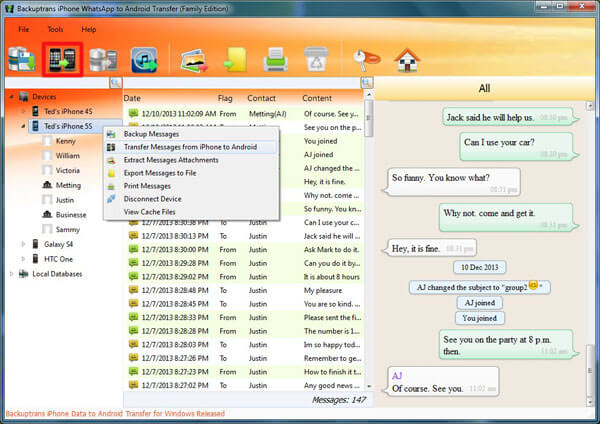 - 步骤 4. 展开备份内容并选择您要转移的对话。同样,您可以右键单击以获取上下文菜单,然后单击“将此联系人的消息传输到 Android”。然后,您在三星 S22 上启动 WhatsApp 并决定恢复其上的 WhatsApp 数据,这将成功传输您的聊天记录。