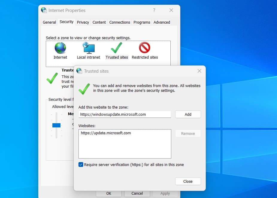 如果在应用上述解决方案后仍然遇到相同的问题,请尝试将 Windows 更新服务器地址添加到 Windows 中的受信任网站,以检查这是否是问题的根本原因。