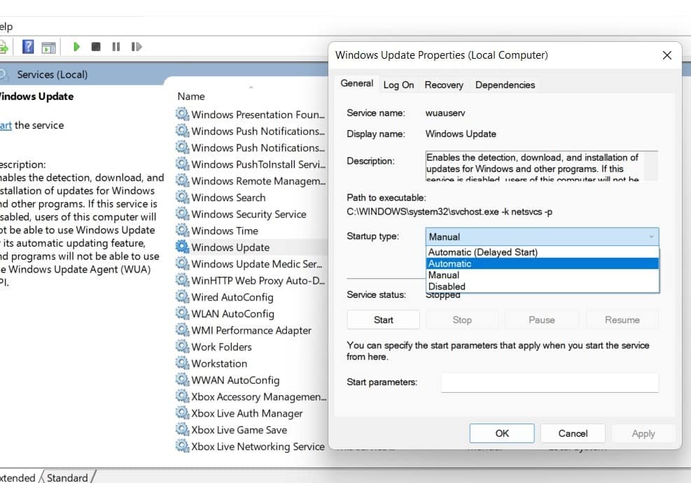 - 确保自动选择启动类型,如果服务未运行,请单击启动。