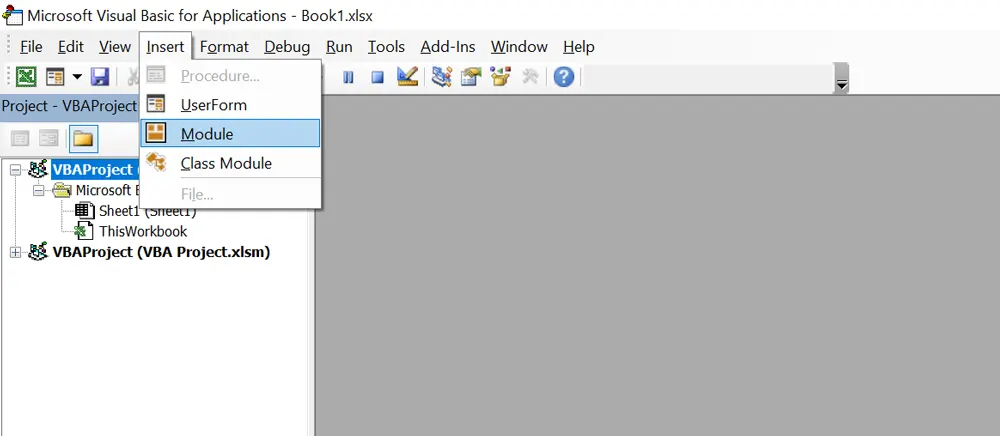 - 现在,单击“插入”并从下拉列表中选择“模块”选项。