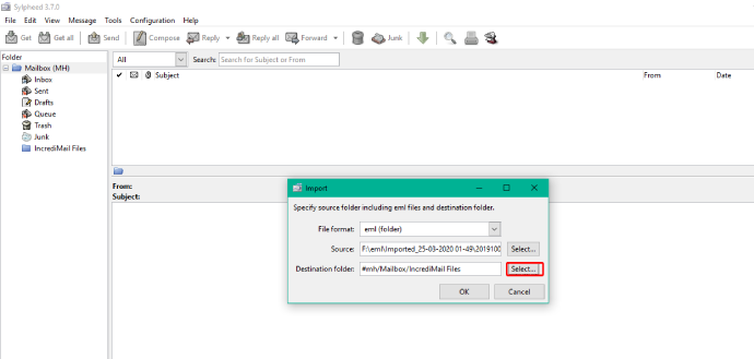 第 2 阶段:将 IncrediMail 电子邮件导入到 Sylpheed