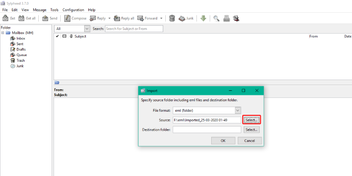 - 现在,通过点击在您的 Sylpheed 帐户中选择一个目标文件夹选择选项。