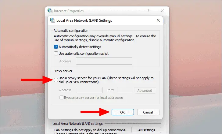 - 取消选中“为 LAN 使用代理服务器”复选框。
