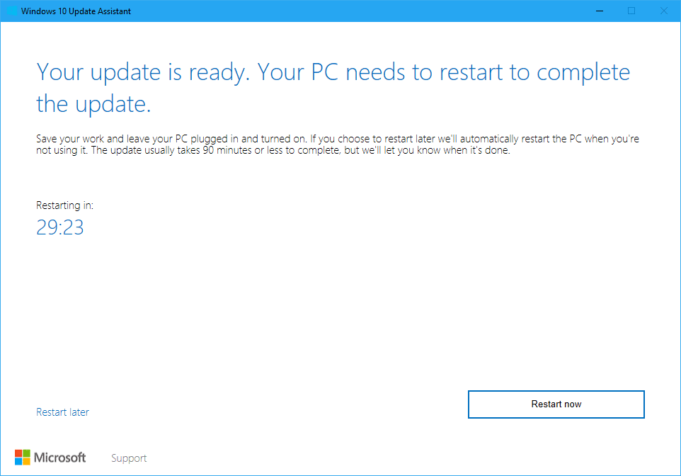 随着下载的进行,更新助手将随时向您通报其进度,下载过程将需要一些时间才能完成。等到完成 100% 完成。下载完成后,更新助手将验证下载以确保安装成功。现在您将看到如下图所示的屏幕,您的更新已准备就绪。您的电脑需要重新启动才能完成更新。