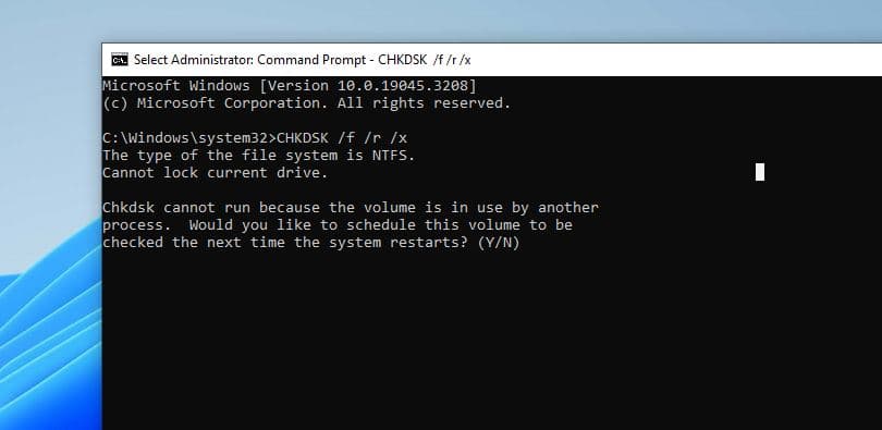 - 键入 Y 并按 Enter 键以安排在下次启动时进行扫描。