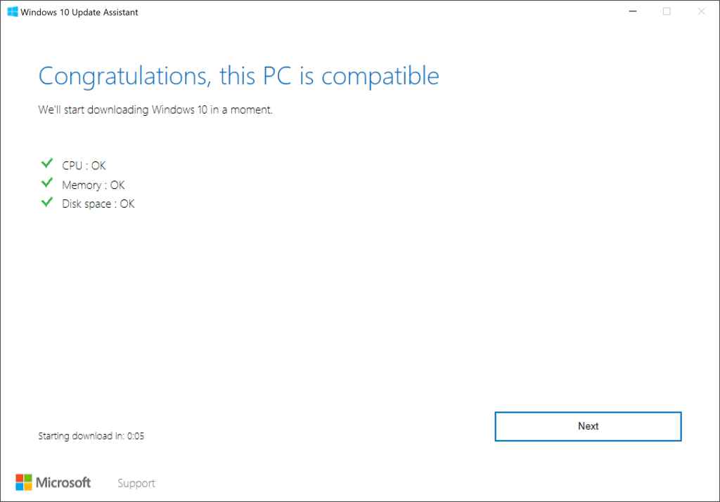 - 首先,更新助手将对您的系统运行兼容性检查并检查其每个主要组件。