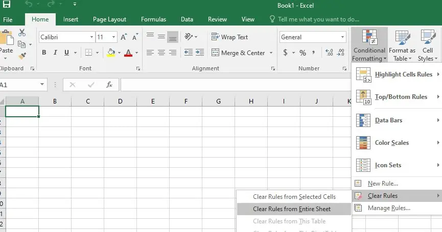 - 现在单击“条件格式”,然后单击“清除规则”,然后单击“从整个工作表中清除规则”