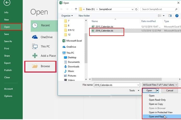 - 在“文件”选项卡上,然后单击“打开”,单击“浏览”并找到 Excel 工作表(导致问题的原因),然后选择它