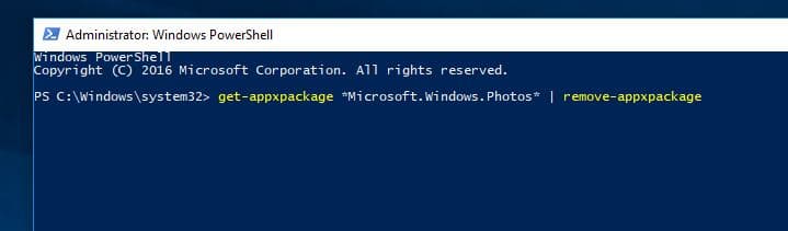输入命令获取 AppxPackage *Microsoft.Windows.Photos* |删除-AppxPackage 并按 Enter。