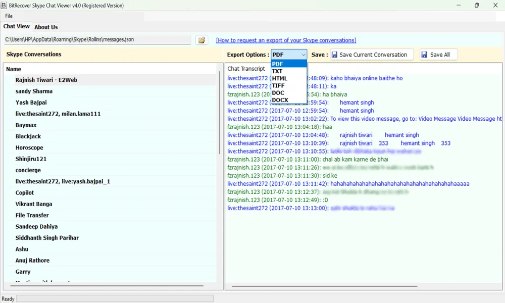 并非每个人都希望将聊天从 Skype 迁移到 Teams,因为许多用户还希望查看 Skype 聊天或将其转换为 PDF、TXT、HTML、DOC、DOCX 或其他此类文件格式。因此,这样做不仅可以帮助他们导入或阅读它们,还可以在丢失之前下载 Skype 聊天。因此,在这种情况下,依靠BitRecover Skype 聊天查看器是最好的选择。因此,请看看这位专家经过尝试、测试和推荐的解决方案,该解决方案允许用户根据专业要求以所需的文件格式查看和转换 Skype 聊天数据。使用该实用程序的快速简便的步骤如下: