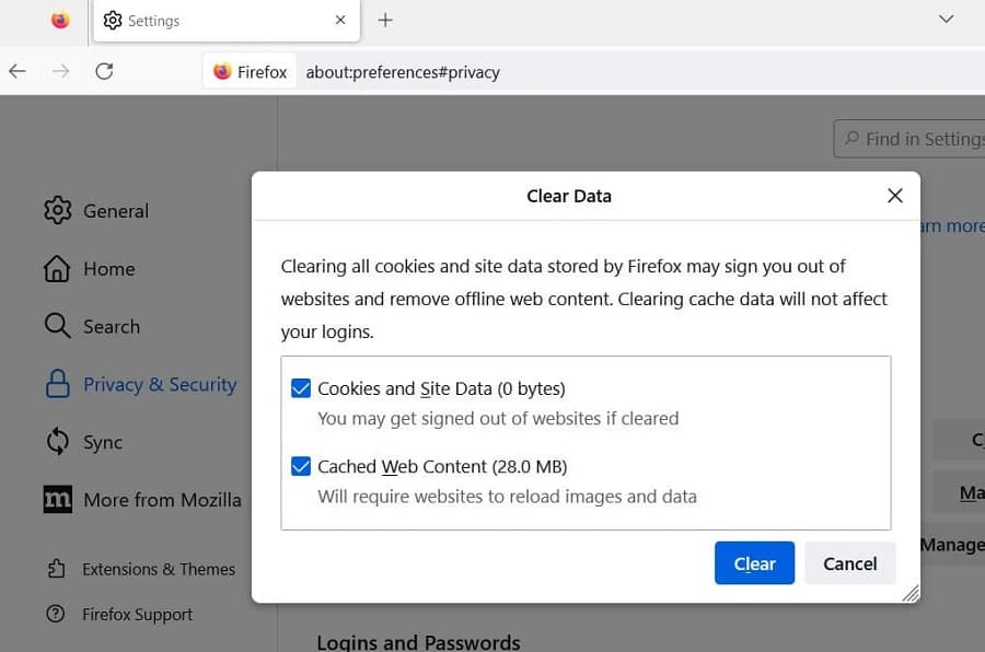 - 导航到 cookie 和站点数据下,然后在确认弹出窗口打开时单击“清除数据”,然后单击“清除”。