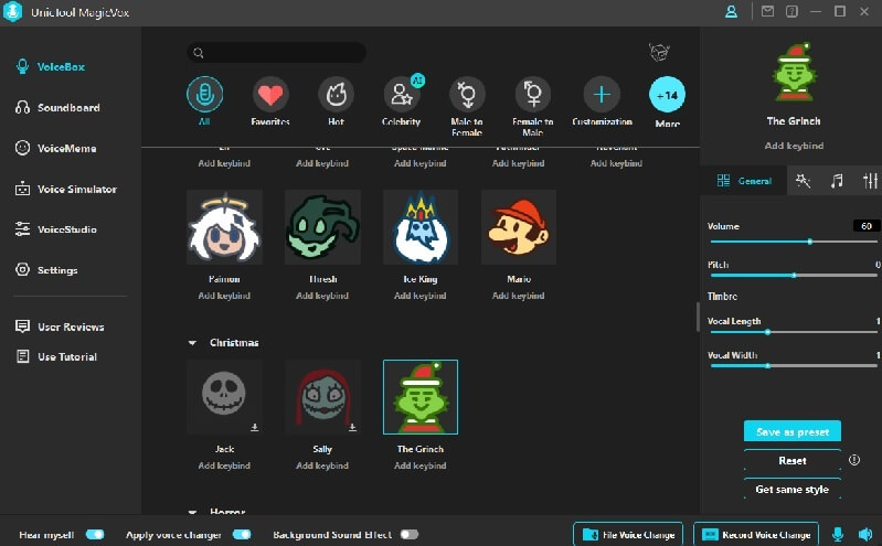 MagicVox 是一款变声器,可在游戏或直播期间实时修改您的声音,拥有超过 400 种音效的丰富库,包括 The Grinch 独特的声音。此外,它还提供圣诞老人等其他著名圣诞人物的各种声音。