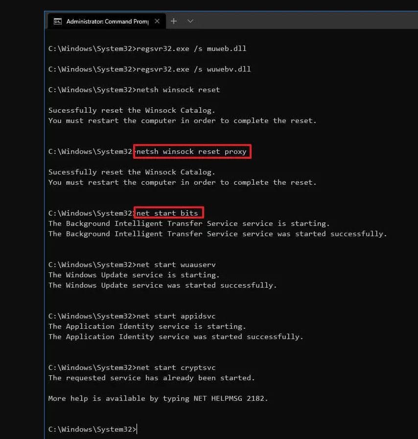 现在我们要将 BITS 服务和 Windows Update 服务重置为默认安全描述符。为此,请运行以下命令并在每行上按 Enter 键: