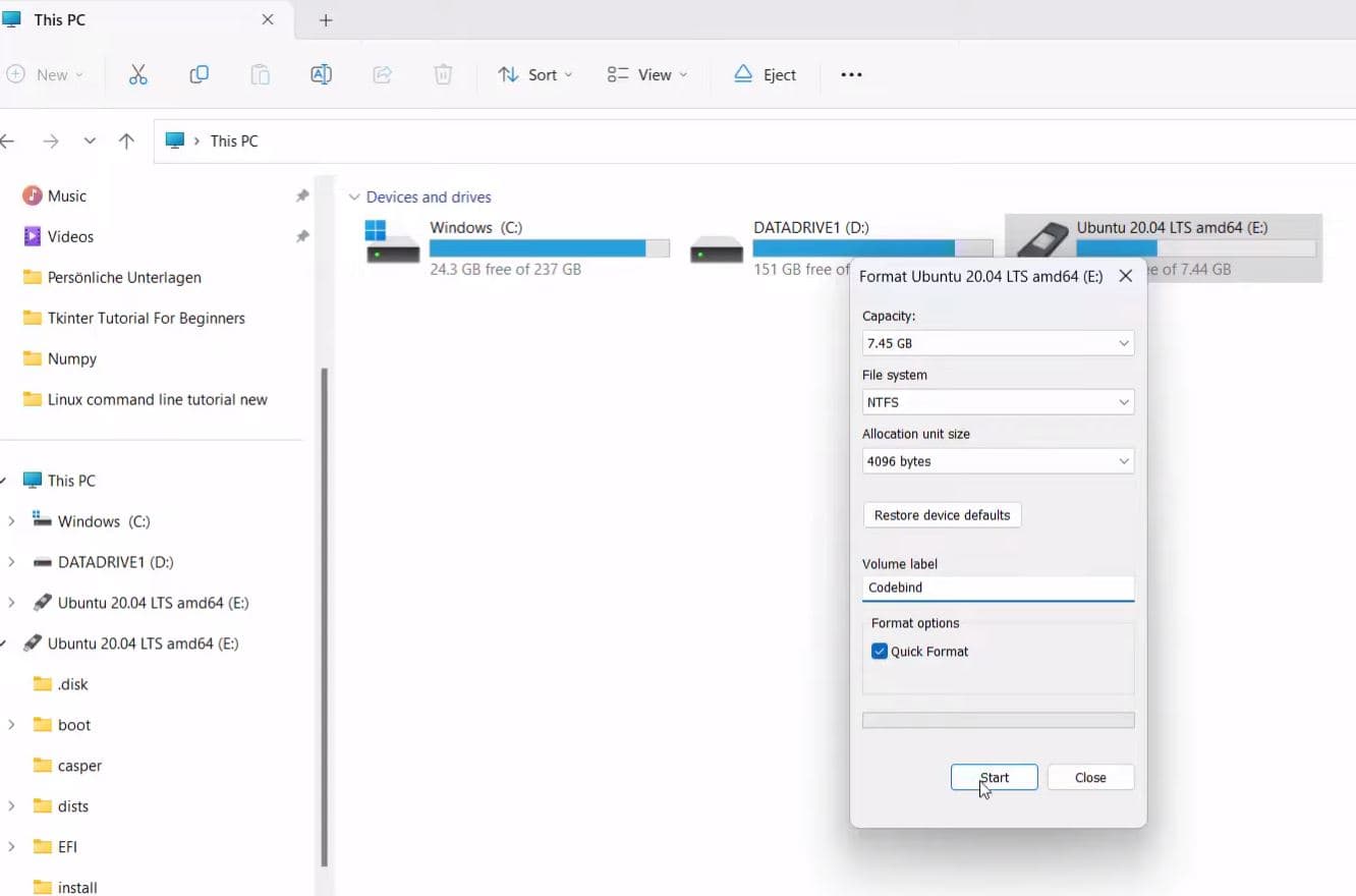 - 在“格式”窗口中,从“文件系统”下拉菜单中选择“NTFS”,然后单击“开始”。