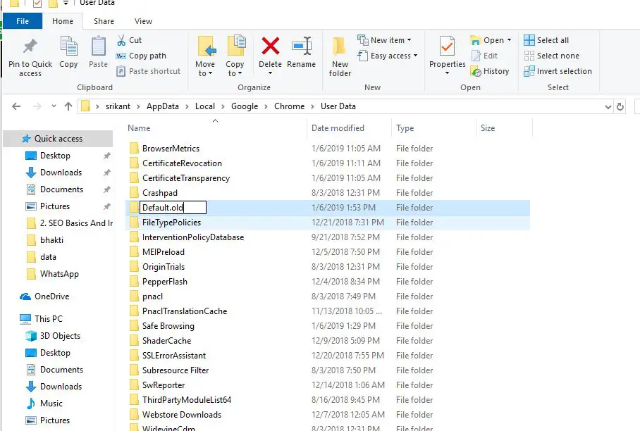 - 查找名为“Default”的文件夹,然后选择并将其重命名为 Default.old