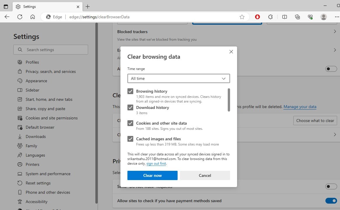Microsoft Edge 保留缓存数据以增强浏览体验。缓存数据和 cookie 会随着时间的推移而累积并影响浏览器性能。让我们首先清除浏览数据,包括缓存和 cookie,这可能会优化浏览器性能。
