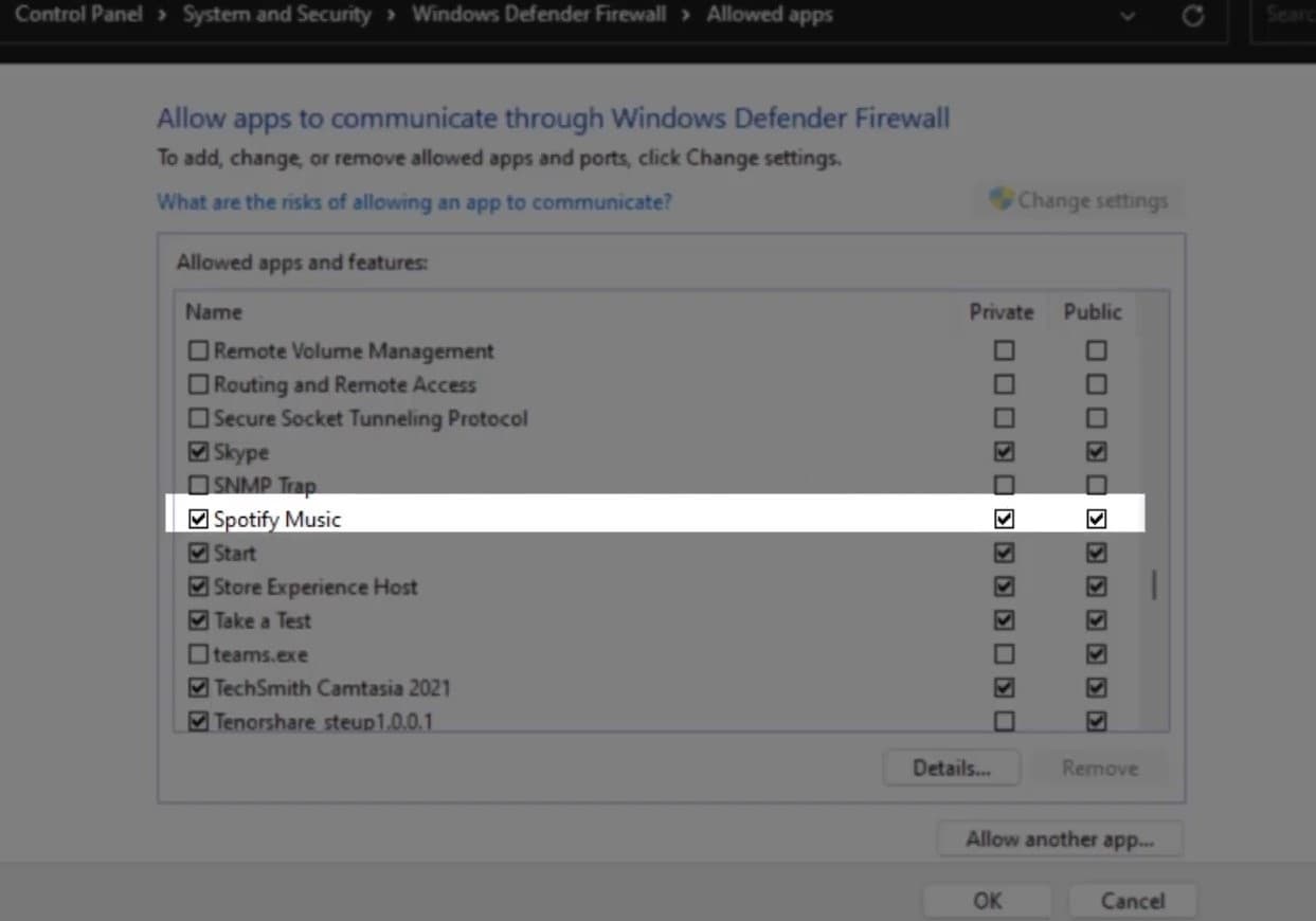 - 向下滚动以在列表中找到 Spotify Music,然后勾选旁边的公共和私人复选框。然后,单击“确定”。