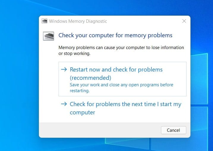 - Windows 将运行内存诊断测试并在重新启动时提供结果。