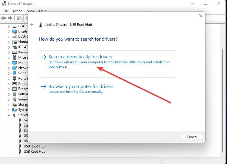 - 选择自动搜索更新的驱动程序软件的选项。 Windows 将搜索并安装适用于您的 USB 设备的最新驱动程序。