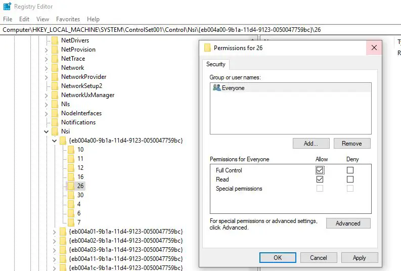 - HKEY_LOCAL_MACHINESYSTEMControlSet001ControlNsi{eb004a00-9b1a-11d4-9123-0050047759bc}26