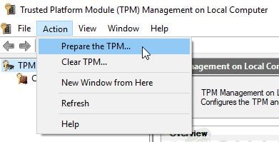- 单击操作,然后从下拉菜单中选择准备TPM选项。按照屏幕上的说明完成启动过程