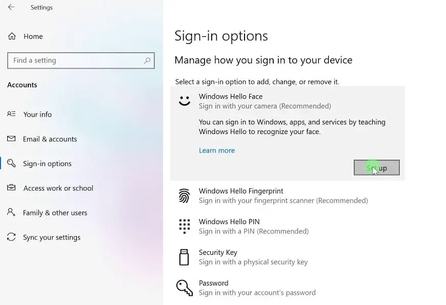 - 选择面部识别(Windows Hello),以使用PC的红外摄像头或外部红外摄像头设置面部识别登录。