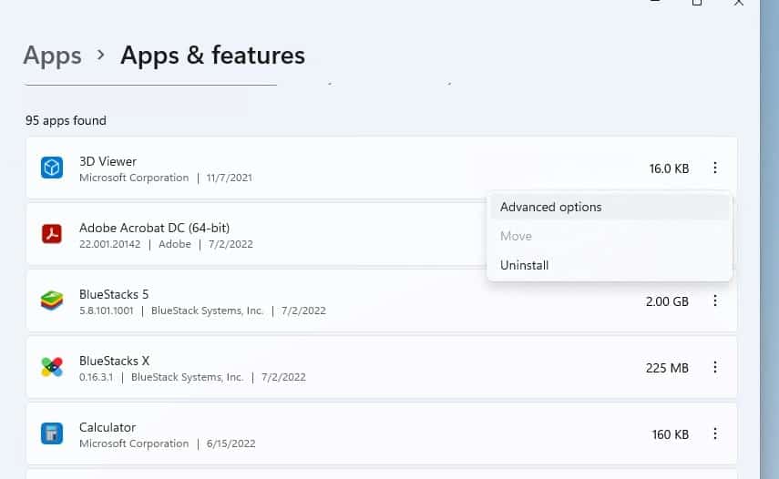 - 在这里您将找到应用程序列表,只需单击要禁用在后台运行的应用程序旁边的三点菜单图标,然后选择高级选项,