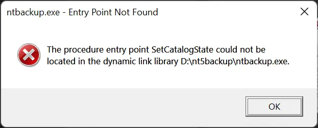 实际上,Windows 10 和 Windows 11 用户在尝试使用 Windows NTBackup 工具从 BKF 文件恢复数据时遇到了此问题。出现“无法定位 NTBackup 的过程入口点 SetCatalogState”错误的原因是 NTBackup 安装程序中缺少支持文件。