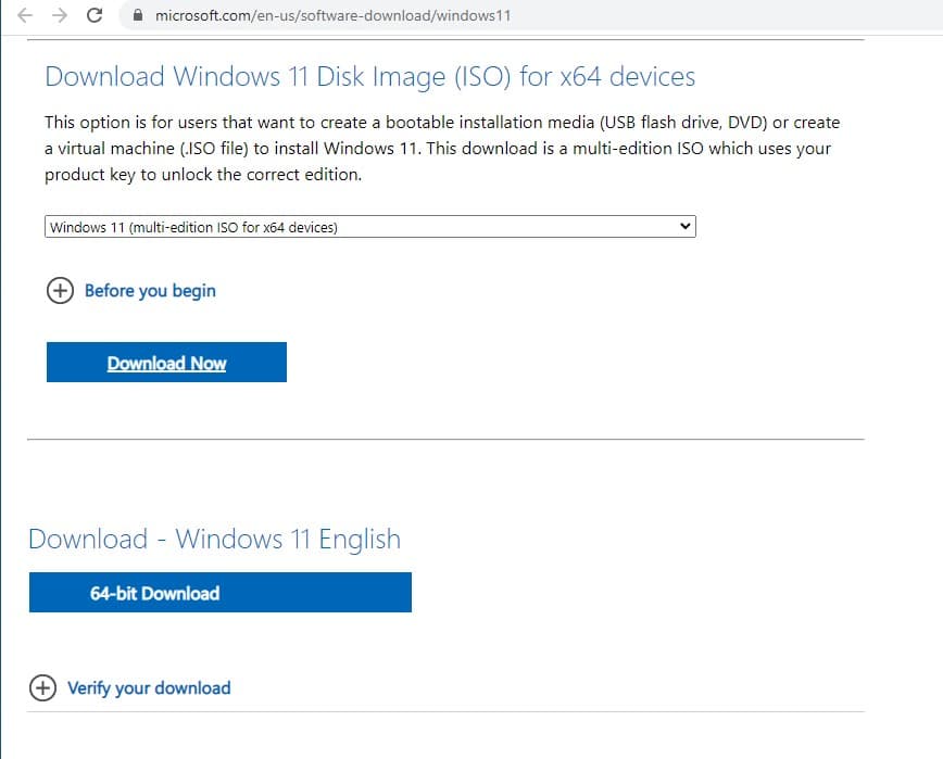 - 找到“下载Windows 11磁盘映像(ISO)”部分,从下拉菜单中选择“ Windows 11”,然后单击“下载”