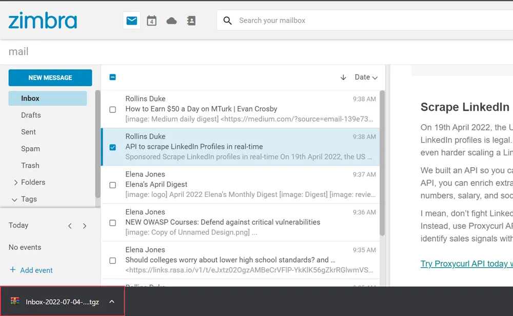 Zimbra 电子邮件已成功下载。您可以看到弹出完成消息。
