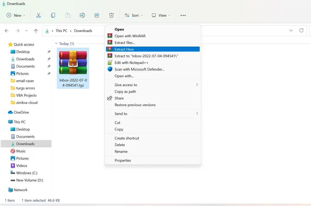 - 此后,右键单击压缩的 TGZ 文件并选择提炼这里选项。