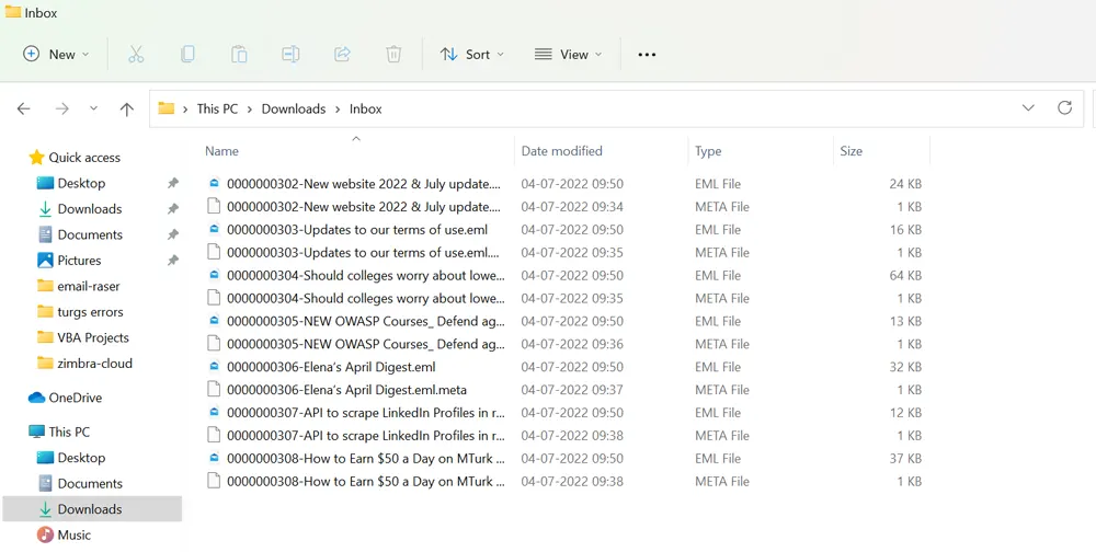 - 打开该文件夹并查看 Zimbra 电子邮件已成功下载到带有单独元文件的 EML 文件中。